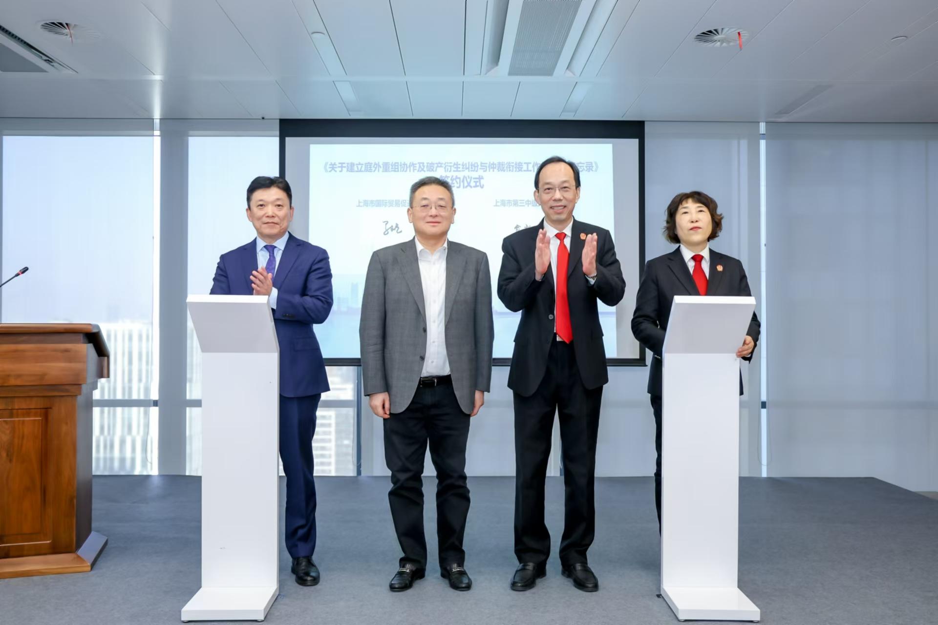 上海市國際貿(mào)易促進委員會副會長、上海國仲副主任馬屹和上海市第三中級人民法院副院長俞秋瑋分別代表兩家單位簽署《備忘錄》,席建林院長與周敏浩會長共同見證。根據(jù)《備忘錄》的相關(guān)內(nèi)容,雙方未來將就庭外重組協(xié)作、破產(chǎn)衍生糾紛仲裁銜接等事宜開展合作,在制度設(shè)計、成本優(yōu)化等方面探索有效的訴仲協(xié)同機制,提高破產(chǎn)衍生糾紛的審理效率與專業(yè)度,提升上海法律服務(wù)機構(gòu)的品牌影響力。