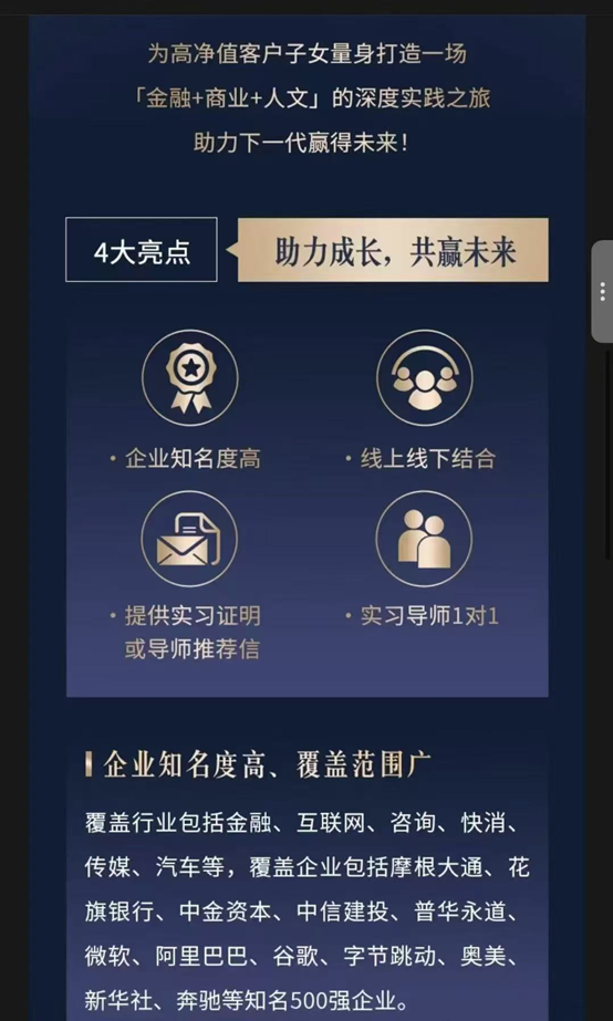 日前,興業(yè)銀行私人銀行推出一項“2025菁英實習計劃”,可以為高凈值客戶的子女提供知名企業(yè)實習機會,覆蓋行業(yè)涉及金融、互聯(lián)網(wǎng)、咨詢快消等行業(yè)。