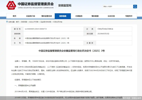 5月30日,安徽證監(jiān)局發(fā)布公告指出,時(shí)任中信證券信息技術(shù)中心高級(jí)經(jīng)理李海鵬存在違法行為,其獲得中信證券CRM系統(tǒng)應(yīng)用開發(fā)崗權(quán)限,可以獲取中信證券所有客戶的賬戶信息、資產(chǎn)規(guī)模、交易持倉(cāng)等未公開信息。2019年11月1日至2023年2月21日,李海鵬通過(guò)CRM系統(tǒng),獲知高某基金的持倉(cāng)、委托、當(dāng)日成交記錄等未公開信息,其利用未公開信息違規(guī)交易股票,同時(shí)存在趨同交易的情況。安徽證監(jiān)局決定,沒收李海鵬違法所得213.14萬(wàn)元,并處以213.14萬(wàn)元罰款。