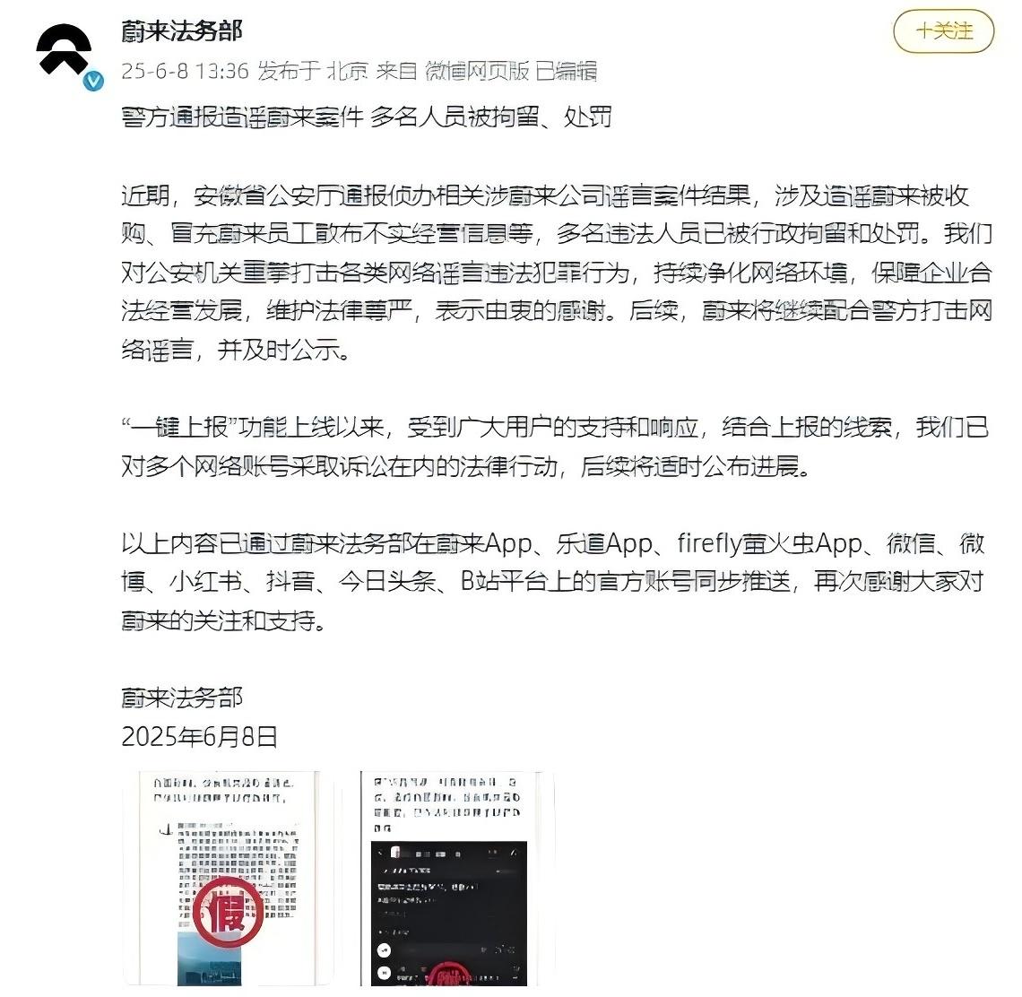 以上內(nèi)容已通過蔚來法務部在蔚來App、樂道App、firefly螢火蟲App、微信、微博、小紅書、抖音、今日頭條、B站平臺上的官方賬號同步推送,再次感謝大家對蔚來的關(guān)注和支持。