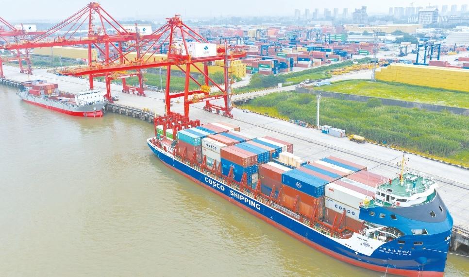 海關(guān)總署9日發(fā)布數(shù)據(jù)顯示,今年前5個(gè)月我國(guó)貨物貿(mào)易進(jìn)出口同比增長(zhǎng)2.5%。圖為9日當(dāng)天的南京港龍?zhí)陡蹍^(qū)。(視覺中國(guó))