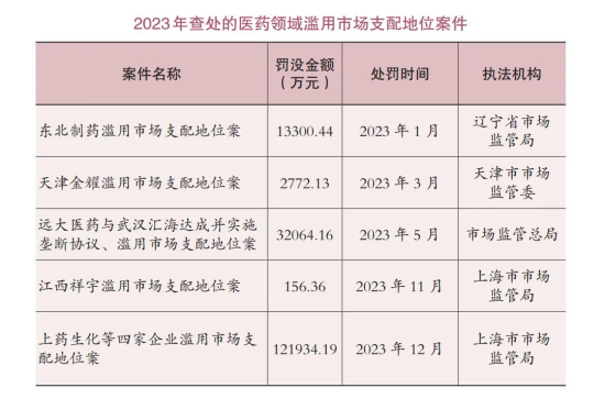 去年6月,根據市場監(jiān)管總局(國家反壟斷局)發(fā)布的《中國反壟斷執(zhí)法年度報告(2023)》,醫(yī)藥領域共查處濫用市場支配地位案件5件,罰沒金額合計17.02億元。其中4起都為原料藥市場壟斷,另外1起為短缺藥不公平高價行為壟斷調查案件。