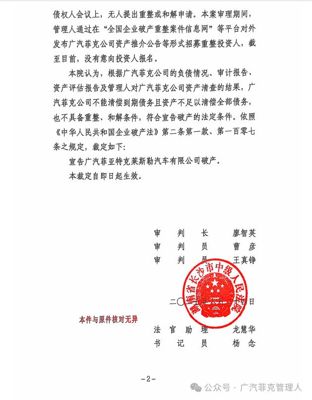 因廣汽菲克公司已無重整可能,根據(jù)部分債權(quán)人意見,經(jīng)債權(quán)人委員會(huì)討論,管理人已經(jīng)申請(qǐng)長(zhǎng)沙中院裁定宣告廣汽菲克公司破產(chǎn)。附:長(zhǎng)沙中院《民事裁定書》(2022)湘01破214號(hào)-2號(hào)。
