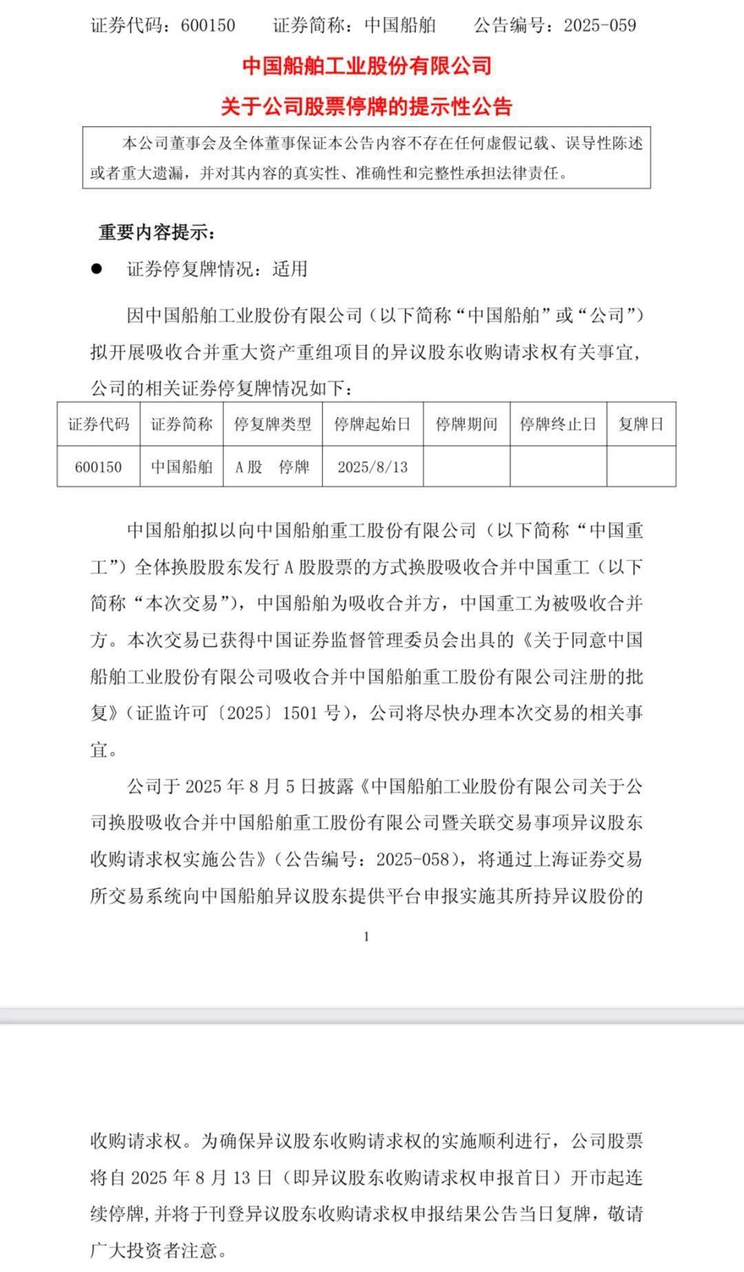 8月4日晚間,中國船舶發(fā)布公告稱,公司擬開展吸收合并重大資產(chǎn)重組項(xiàng)目的異議股東收購請(qǐng)求權(quán)有關(guān)事宜,公司股票將自2025年8月13日開市起連續(xù)停牌,并將于刊登異議股東收購請(qǐng)求權(quán)申報(bào)結(jié)果公告當(dāng)日復(fù)牌。