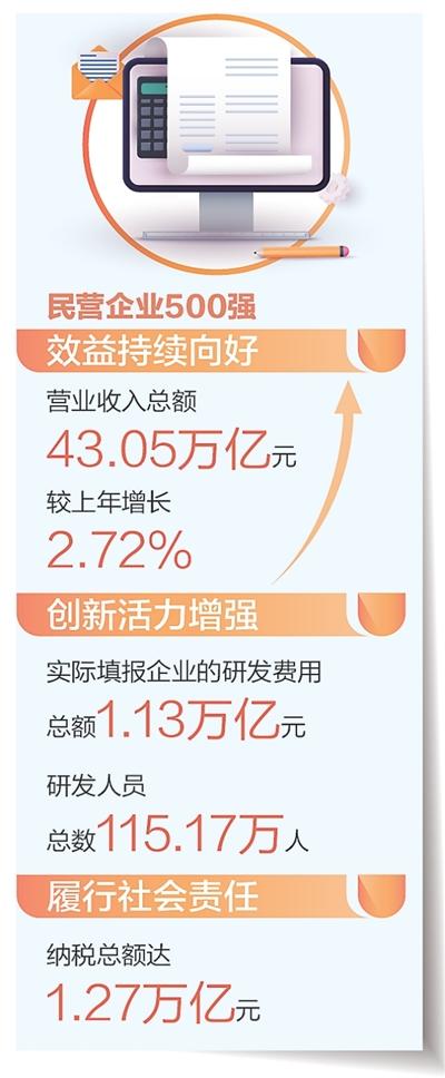 分析報(bào)告顯示,民營企業(yè)500強(qiáng)創(chuàng)新活力持續(xù)增強(qiáng)。民營企業(yè)500強(qiáng)中實(shí)際填報(bào)企業(yè)的研發(fā)費(fèi)用總額1.13萬億元,研發(fā)人員總數(shù)115.17萬人,平均研發(fā)經(jīng)費(fèi)投入強(qiáng)度2.77%。