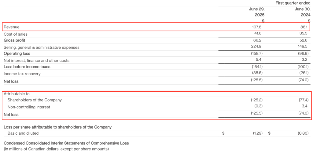 加拿大鵝是全球高性能奢華生活方式品牌,一家定位高端的羽絨服制造公司,創(chuàng)立于1957年。據(jù)加拿大鵝7月31日發(fā)布的截至2025年6月29日的2026財(cái)年第一財(cái)季財(cái)務(wù)業(yè)績顯示,第一財(cái)季實(shí)現(xiàn)營收1.078億美元,同比增長22.4%,按固定匯率計(jì)算增長21.5%;歸母凈虧損為-1.252億美元,去年同期為-0.774億美元,虧損同比擴(kuò)大超六成。