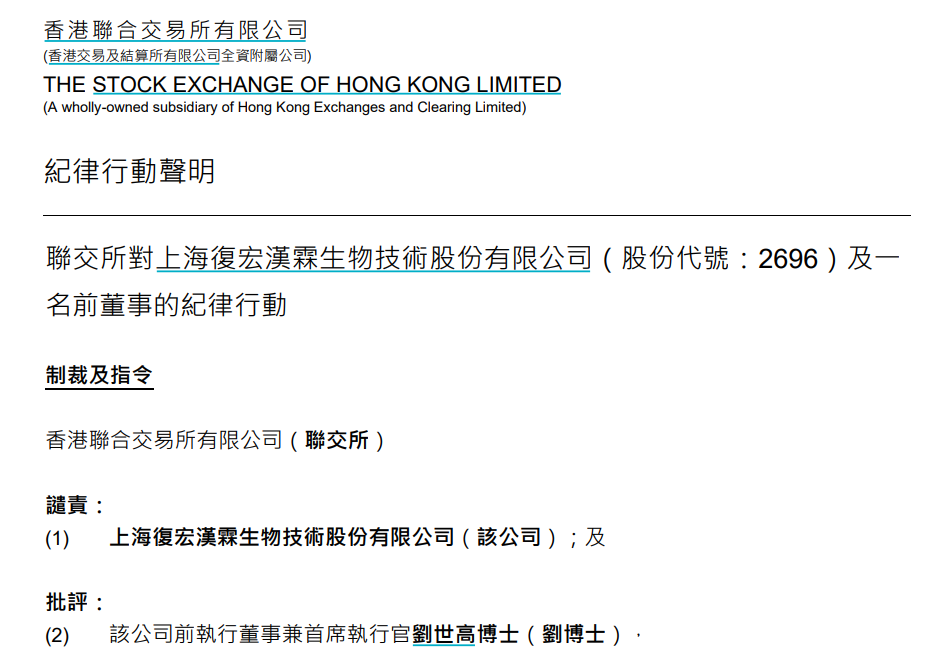 9月2日,復(fù)宏漢霖(2696.HK)公告了一份聯(lián)交所對(duì)公司及一名前董事的紀(jì)律行動(dòng)聲明。文件顯示,復(fù)宏漢霖受到港交所譴責(zé),而公司前執(zhí)行董事兼CEO劉世高受到批評(píng)。港交所要求劉世高接受26小時(shí)有關(guān)監(jiān)管和法律議題以及上市規(guī)則合規(guī)事宜的培訓(xùn),才能再獲委任為任何已于或?qū)⒂诼?lián)交所上市的公司董事。