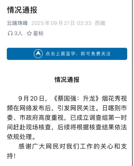 9月21日,“云端珠峰”微信公眾號發(fā)布情況通報指出,日喀則市委、市政府高度重視,已成立調查組第一時間趕赴現場核查,后續(xù)將根據核查結果依法依規(guī)處理。