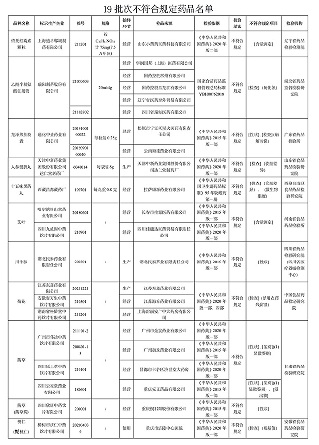 國家藥監(jiān)局表示,對上述不符合規(guī)定藥品,藥品監(jiān)督管理部門已要求相關(guān)企業(yè)和單位采取暫停銷售使用、召回等風(fēng)險控制措施,對不符合規(guī)定原因開展調(diào)查并切實進行整改。