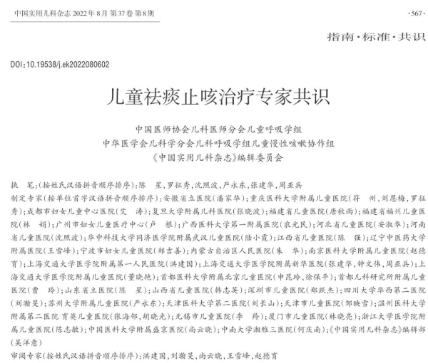 近日,由中國醫(yī)師協(xié)會(huì)兒科醫(yī)師分會(huì)兒童呼吸專家組、中華醫(yī)學(xué)會(huì)兒科學(xué)分會(huì)兒科呼吸學(xué)組兒童慢性咳嗽協(xié)作組、《中國實(shí)用兒科雜志》編輯委員會(huì)發(fā)起,組織全國40位專家制定了《兒童祛痰止咳治療專家共識》,該共識發(fā)布于中國實(shí)用兒科雜志2022年8月第37卷第8期。