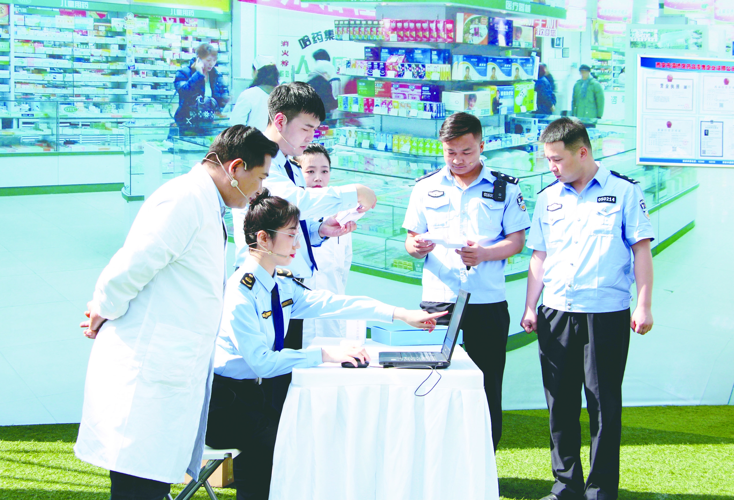 圖為在演練現(xiàn)場(chǎng)灞橋區(qū)市場(chǎng)監(jiān)管局聯(lián)合西安市公安局灞橋分局模擬對(duì)涉事藥品企業(yè)展開(kāi)調(diào)查。賀一辰 攝