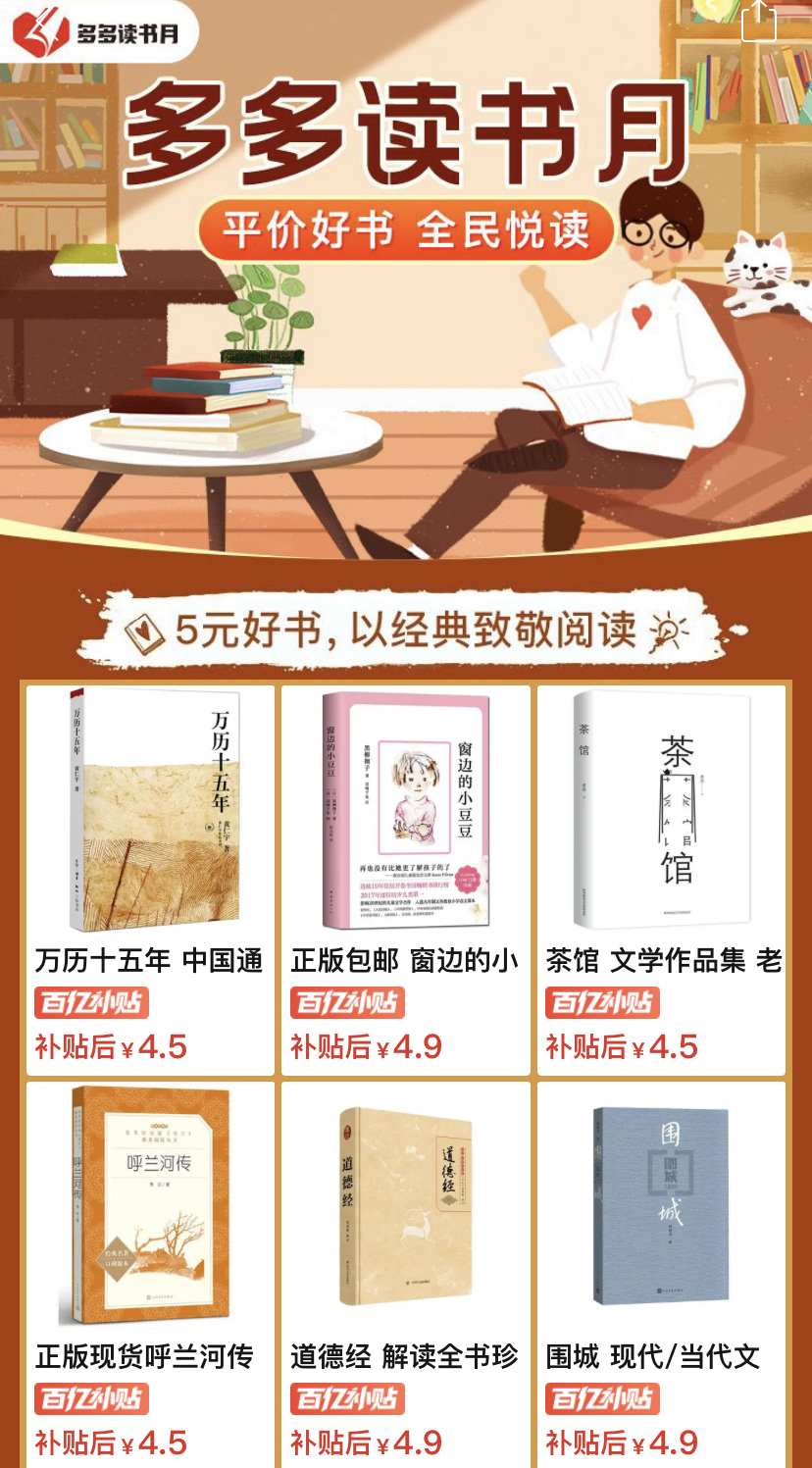 “多多讀書月”負責人表示,此次“知識普惠行動”致力于“以經典致敬閱讀”,補貼書目由十余位資深編輯從諾貝爾文學獎、雨果獎、星云獎、茅盾文學獎、施耐庵文學獎等獲獎作品及全網各大閱讀榜單中精選而來,包括商務印書館、三聯書店、人民文學出版社、中信出版社、中華書局等出版的眾多經典名作。入選圖書上千款,可享受讀書基金補貼,幫助平臺近8億用戶以全網最低價實現“悅讀”。用戶通過拼多多App百億補貼頻道或搜索“讀書月”“多多讀書月”便可從平臺輯錄的讀書清單里以優(yōu)惠價格“拼購”所喜愛的書籍。