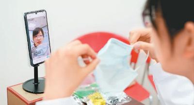 在上海市黃浦區(qū)打浦橋街道社區(qū)衛(wèi)生服務(wù)中心,家庭醫(yī)生在直播中與居民就戴口罩的問題進(jìn)行互動(dòng)。新華社記者 劉 穎攝