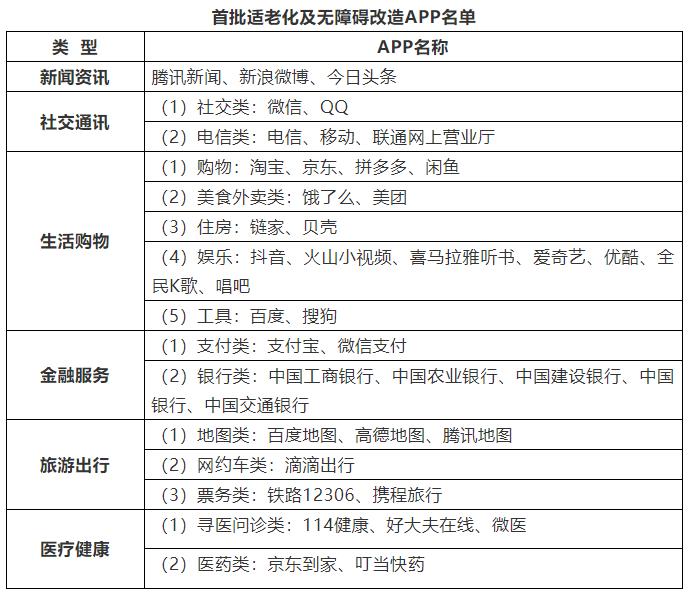 《方案》要求,開展老年人、殘疾人常用移動互聯(lián)網(wǎng)應用(APP)的適老化及無障礙改造。立足老年人、殘疾人的實際生活體驗,豐富滿足其需求的移動互聯(lián)網(wǎng)應用種類和功能,對《工業(yè)和信息化部中國殘疾人聯(lián)合會關(guān)于推進信息無障礙的指導意見》中列出的移動互聯(lián)網(wǎng)應用十大領域、注冊用戶數(shù)超過5000萬人、同類產(chǎn)品中市場份額排名前5名的APP進行適老化及無障礙改造。首批優(yōu)先推動新聞資訊、社交通訊、生活購物、金融服務、旅游出行、醫(yī)療健康等6大類、共43個APP進行適老化及無障礙改造。中國信息通信研究院協(xié)助各互聯(lián)網(wǎng)企業(yè),在開發(fā)設計移動互聯(lián)網(wǎng)應用(APP)的過程中落實信息無障礙有關(guān)標準的要求,并將無障礙優(yōu)化納入產(chǎn)品及服務的日常維護流程。
