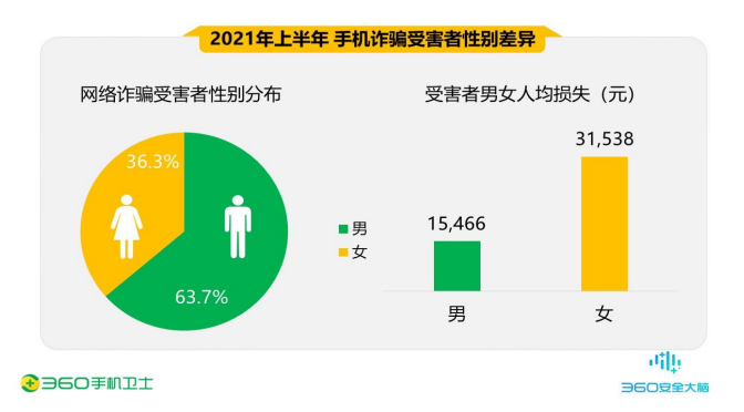 根據(jù)《報(bào)告》,從舉報(bào)用戶的性別差異來(lái)看,今年上半年360手機(jī)先賠接到的詐騙舉報(bào)男性受害者占63.7%,女性受害者占36.3%,男性比例明顯高于女性。而從人均損失來(lái)看,男性受害者的人均損失低于女性。其中,男性為15466元,女性為31538元。