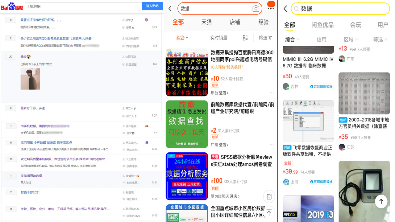灰色數(shù)據(jù)交易藏匿于百度貼吧、淘寶、閑魚等平臺(tái)。