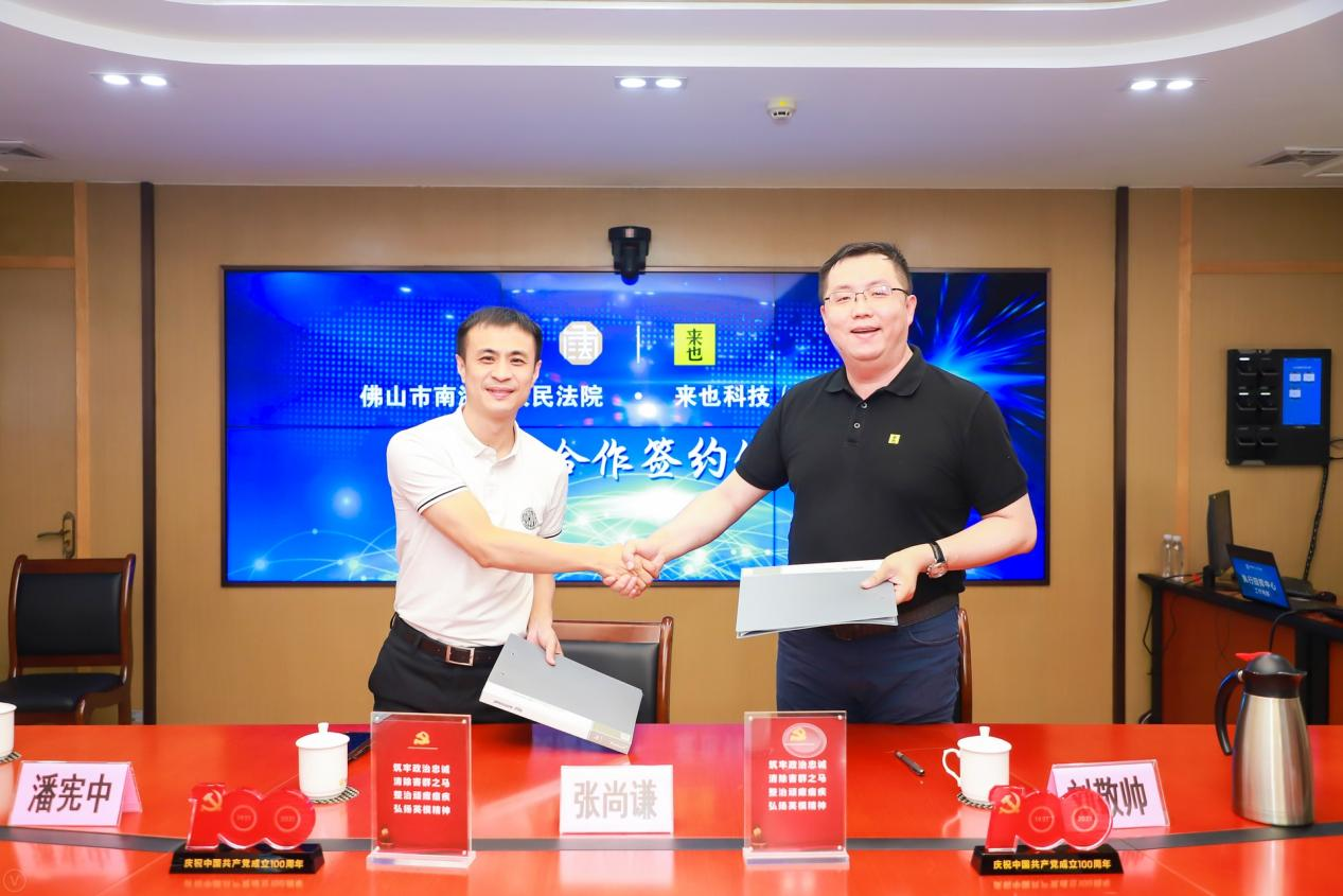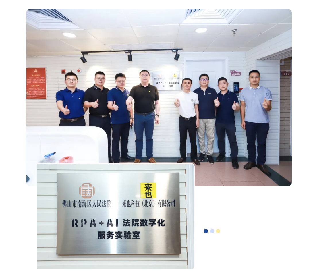 8 月 31 日,來也科技與廣東省佛山市南海區(qū)人民法院戰(zhàn)略合作簽約儀式舉行,會上佛山市南海區(qū)人民法院黨組成員、執(zhí)行局局長張尚謙與來也科技合伙人兼副總裁劉敬帥簽署戰(zhàn)略合作協(xié)議,正式建立合作關(guān)系;隨后舉行揭牌儀式,宣布 RPA+AI 法院數(shù)字化服務(wù)實驗室成立,雙方參觀了實驗室并展開深度探討。