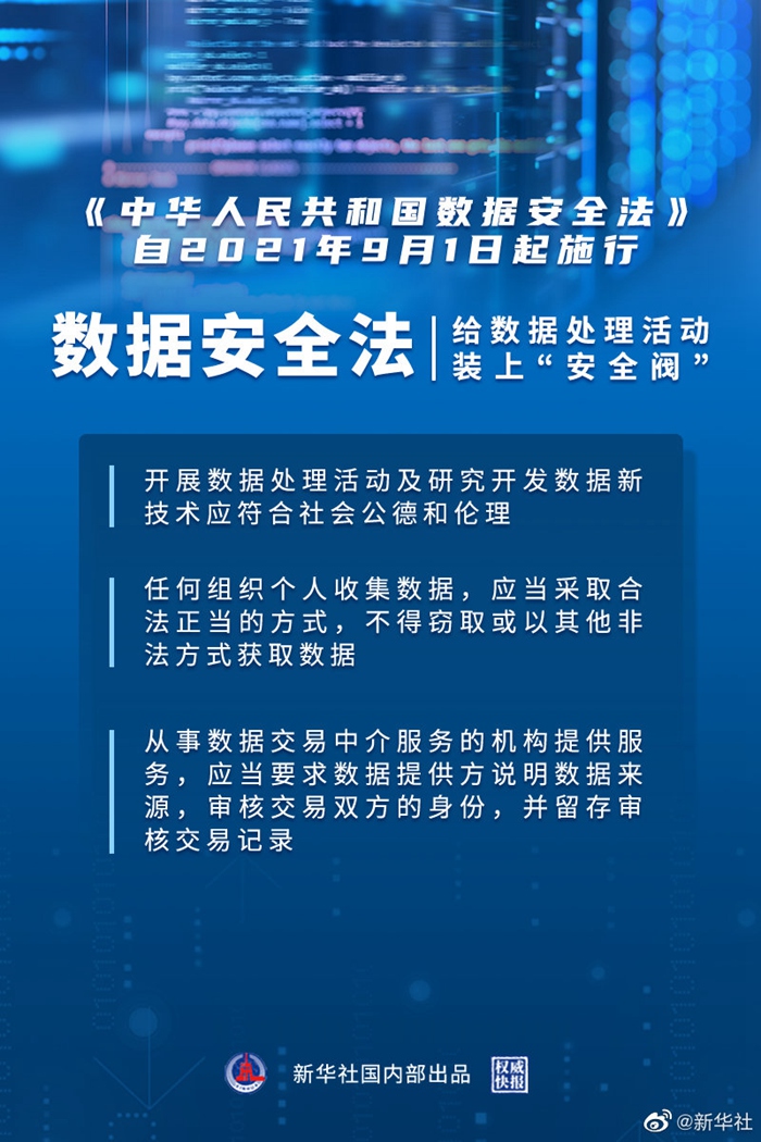 個(gè)人數(shù)據(jù)被不法分子竊取、買賣的問(wèn)題咋破解?數(shù)據(jù)安全法自9月1日起施行,明確:①國(guó)家建立數(shù)據(jù)分類分級(jí)保護(hù)制度。②開展數(shù)據(jù)處理活動(dòng)以及研究開發(fā)數(shù)據(jù)新技術(shù),應(yīng)當(dāng)有利于促進(jìn)經(jīng)濟(jì)社會(huì)發(fā)展,增進(jìn)人民福祉,符合社會(huì)公德和倫理。③國(guó)家建立健全數(shù)據(jù)交易管理制度,規(guī)范數(shù)據(jù)交易行為,培育數(shù)據(jù)交易市場(chǎng)。④不得竊取或以其他非法方式獲取數(shù)據(jù);數(shù)據(jù)交易中介服務(wù)機(jī)構(gòu)應(yīng)要求數(shù)據(jù)提供方說(shuō)明數(shù)據(jù)來(lái)源、審核交易雙方身份。⑤國(guó)家機(jī)關(guān)應(yīng)建立健全數(shù)據(jù)安全管理制度,保障政務(wù)數(shù)據(jù)安全。愈加嚴(yán)密的法律體系,讓你我“觸網(wǎng)”無(wú)憂!(記者白陽(yáng),海報(bào)設(shè)計(jì)楊軼群)