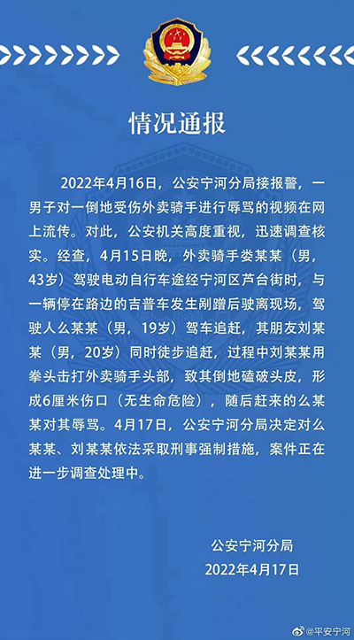 4月17日,天津市公安局寧河公安分局發(fā)布情況通報(bào)。通報(bào)中指出,4月16日,寧河公安分局接報(bào)警,一男子對一倒地受傷外賣騎手進(jìn)行辱罵的視頻在網(wǎng)上流傳。經(jīng)查,4月15日晚,外賣騎手婁某某駕駛電動自行車途經(jīng)寧河區(qū)蘆臺街時,與一輛停在路邊的吉普車發(fā)生剮蹭后駛離現(xiàn)場,駕駛?cè)嗣茨衬绸{車追趕,其朋友劉某某同時徒步追趕,過程中劉某某用拳頭擊打外賣騎手頭部,致其倒地磕破頭皮,形成6厘米傷口(無生命危險(xiǎn)),隨后趕來的么某某對其辱罵。