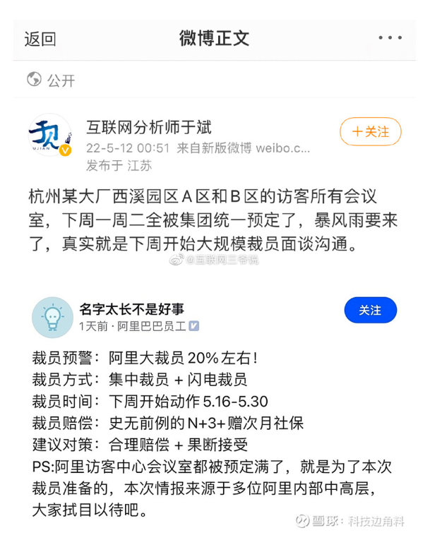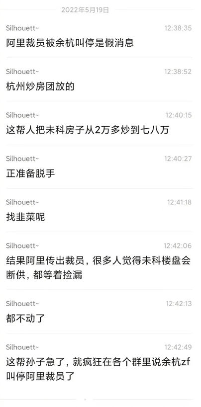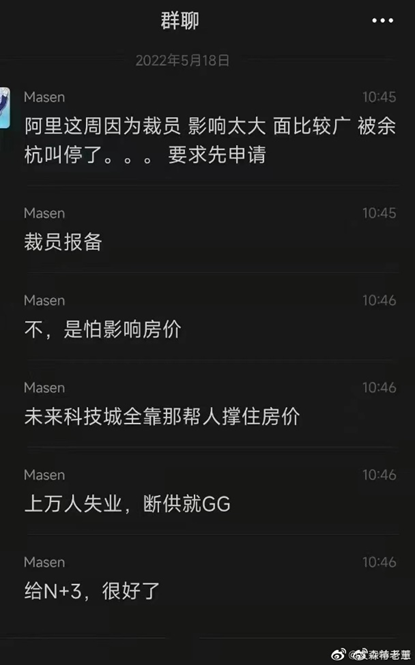 這般異常也引發(fā)了外界諸多猜測(cè)。5月18日,一則微信聊天記錄截圖在微博流傳,據(jù)截圖顯示,有網(wǎng)友稱“阿里這周因?yàn)椴脝T,影響太大,面比較廣,被余杭叫停了,要求先申請(qǐng),裁員報(bào)備?!?月19日,另一網(wǎng)友出來(lái)“辟謠”,其稱“阿里裁員被余杭叫停是假消息,杭州炒房團(tuán)放的。”