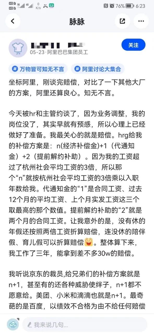 對(duì)于被裁,阿里人似乎并沒(méi)有外界想象中的“憤怒”。法治網(wǎng)研究院發(fā)現(xiàn),一名阿里員工在脈脈上頗為平靜地講述了被裁后的心路歷程。該員工稱自己剛談完賠償,人力給的補(bǔ)償方案是:N(經(jīng)濟(jì)補(bǔ)償金)+1(代通知金)+2(提前解約補(bǔ)助)。整體算下來(lái),工作三年的他可以拿到30萬(wàn)左右的賠償?!斑€是很感謝福報(bào)廠的,卷是卷累歸累,但是在阿里工作這三年,我的人生開(kāi)掛了,有房有車有老婆了,面對(duì)變化,我也有了擁抱的底氣了?!?/p>