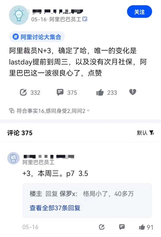 有阿里員工發(fā)文稱,“今天被約談了,這周五走N+3,緩沖29天是N+1,去年的校招生,目前手里沒(méi)offer,正在面試”。該員工還糾結(jié)是再待一個(gè)月還是拿n+3走人。還有員工發(fā)文證實(shí)阿里裁員N+3,并稱和之前流傳消息不同的是,最后期限提前到周三以及沒(méi)有次月社保。