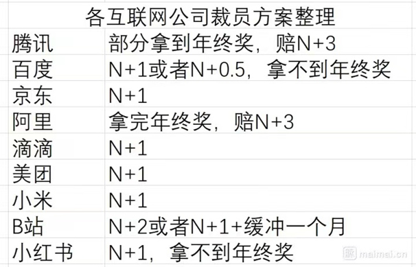 該員工還曬出一份“各互聯(lián)網(wǎng)公司裁員方案整理”的表格,根據(jù)該表,相比其它幾家大廠,阿里的“拿完年終獎(jiǎng),賠N+3”方案如該員工所說(shuō)“還算良心”。