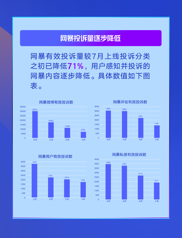 今年7月以來(lái),微博網(wǎng)暴投訴分類下的用戶投訴量逐月降低。截至10月底,網(wǎng)暴有效投訴量相較7月已降低71%,用戶感知并投訴的網(wǎng)暴內(nèi)容逐步降低。