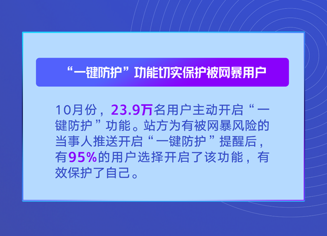 10月份,微博有23.9萬(wàn)名用戶主動(dòng)開啟“一鍵防護(hù)”功能。微博為有被網(wǎng)暴風(fēng)險(xiǎn)的當(dāng)事人推送開啟“一鍵防護(hù)”提醒后,有95%的用戶選擇開啟了該功能,有效保護(hù)了自己。
