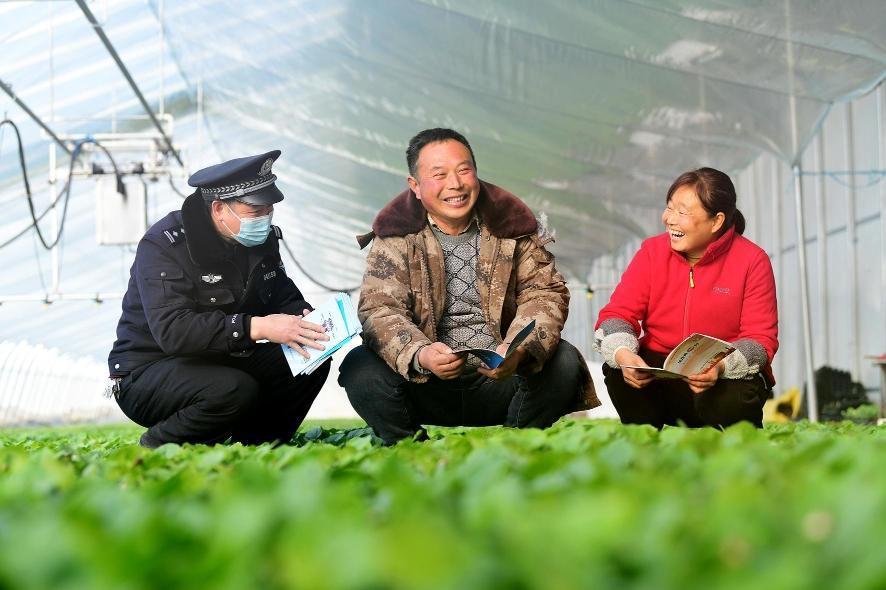 1月29日,安徽省阜南縣公安局會(huì)龍鎮(zhèn)派出所民警在轄區(qū)豐振生態(tài)農(nóng)業(yè)科技園溫室大棚里,向種植戶宣講防范網(wǎng)絡(luò)電信詐騙知識。