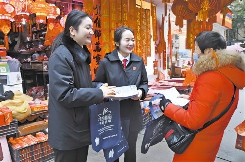 新春佳節(jié),大街小巷熱鬧非凡。近日,重慶市梁平區(qū)人民法院干警走進(jìn)轄區(qū)多個集市開展法治宣傳,為群眾送上“法治年貨”,增添不一樣的年味。活動中,干警們通過發(fā)放宣傳單和普法小卡片,向群眾講解養(yǎng)老詐騙、電信網(wǎng)絡(luò)詐騙的作案方式及識別技巧,提醒群眾在春節(jié)期間守好“錢袋子”。(劉洋 韓佳慧 蔣永莉)