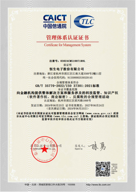 恒生電子股份有限公司的主要業(yè)務(wù)是向金融機(jī)構(gòu)提供整體解決方案和服務(wù),此次認(rèn)證范圍覆蓋了主要業(yè)務(wù)涉及的科技監(jiān)管、軟件著作權(quán)、商業(yè)秘密、反腐敗的合規(guī)管理活動(dòng)。ISO 37301是國際通用的合規(guī)管理體系認(rèn)證標(biāo)準(zhǔn),規(guī)定了組織建立、運(yùn)行、保持和改進(jìn)合規(guī)管理體系的要求,獲得該認(rèn)證,表明恒生公司具備了該標(biāo)準(zhǔn)所要求的合規(guī)管理水平及能力。