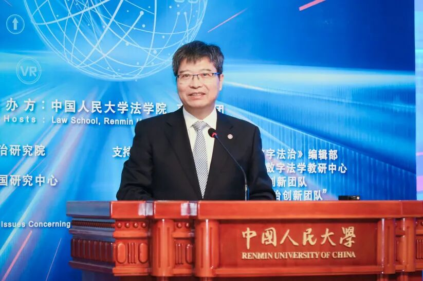 圖為中國(guó)人民大學(xué)校長(zhǎng)林尚立在平行主題論壇——第六屆“未來(lái)法治與數(shù)字法學(xué)”國(guó)際論壇中致辭。