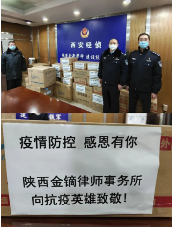 陜西秦石律師事務所積極響應西安市委組織部、市律師行業(yè)黨委號召,在律所主任田磊的帶領(lǐng)下,經(jīng)多渠道采購,為基層一線防控工作人員送去防疫物資,為防疫工作貢獻一份力量。