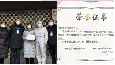 疫情發(fā)生后,陜西樂友律師事務(wù)所律師在西安市法律援助中心的安排下,堅(jiān)守12345市民熱線法律服務(wù)專席,以專業(yè)法律服務(wù)為西安抗疫奉獻(xiàn)自己的力量。1月4日,律所為支持社區(qū)疫情防控工作,通過西安市碑林區(qū)柏樹林街道辦事處,向戰(zhàn)斗在一線的社區(qū)疫情防控人員捐贈(zèng)價(jià)值兩萬元的防控物資。