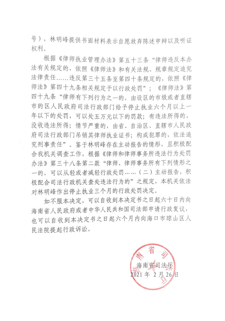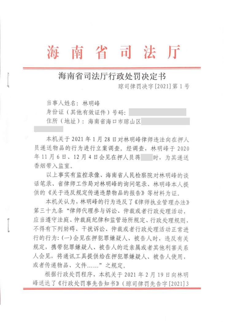海南律師林明峰因違規(guī)會(huì)見被處停止執(zhí)業(yè)三個(gè)月