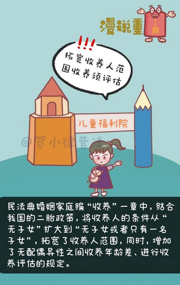 民法典婚姻家庭編“收養(yǎng)”一章中,結(jié)合我國的二胎政策,將收養(yǎng)人的條件從“無子女”擴(kuò)大到“無子女或者只有一名子女”,拓寬了收養(yǎng)人的范圍,同時,增加了無配偶異性之間收養(yǎng)年齡差、進(jìn)行收養(yǎng)評估的規(guī)定。