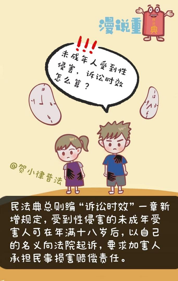 民法典總則編“訴訟時效”一章新增規(guī)定,受到性侵害的未成年人可在年滿十八歲后,以自己的名義向法院起訴,要求加害人承擔(dān)民事?lián)p害賠償責(zé)任。