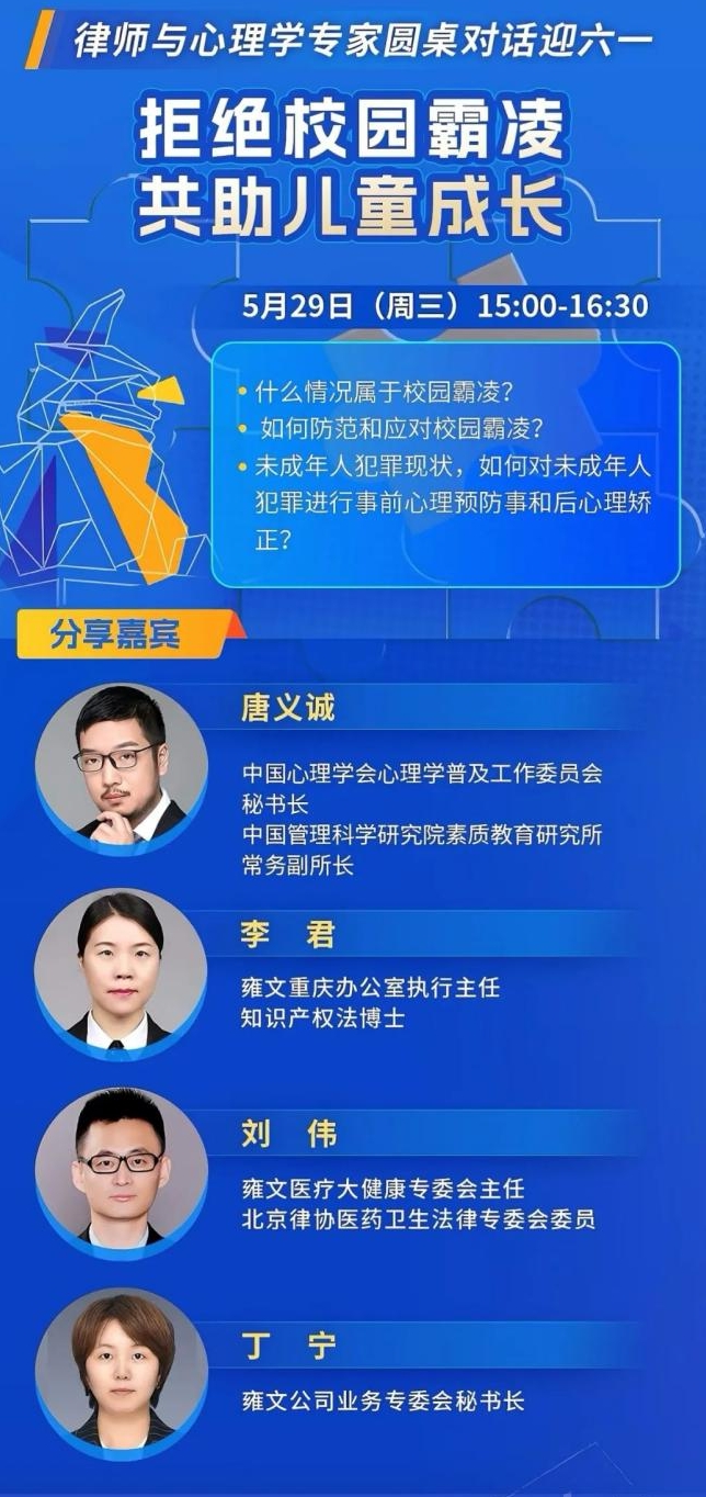 兒童處于個(gè)體發(fā)展的關(guān)鍵階段,是國家的未來和希望。在“六一”兒童節(jié)到來之際,雍文與北大法寶、中國科協(xié)心理應(yīng)急志愿服務(wù)隊(duì)聯(lián)合舉辦律師與心理學(xué)專家圓桌對話:拒絕校園霸凌 共助兒童成?,用法律與心理學(xué)專業(yè)為未成年人健康成長保駕護(hù)航。