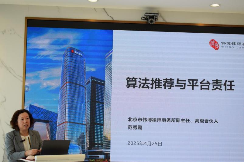 偉博律所副主任范秀霞律師以《算法推薦與平臺責(zé)任》為題,結(jié)合避風(fēng)港原則、紅旗原則等法律規(guī)定,對算法推薦服務(wù)提供者應(yīng)承擔(dān)的注意義務(wù)點進行了提示;結(jié)合司法審判中的具體案例,明確平臺主動審查與被動審查的區(qū)別,合理界定了算法推薦服務(wù)者的責(zé)任邊界。范秀霞認(rèn)為,可以通過運用技術(shù)手段、完善內(nèi)部制度建設(shè)等方式,實現(xiàn)平臺與權(quán)利人的互利共贏,共同營造健康的網(wǎng)絡(luò)內(nèi)容生態(tài)。