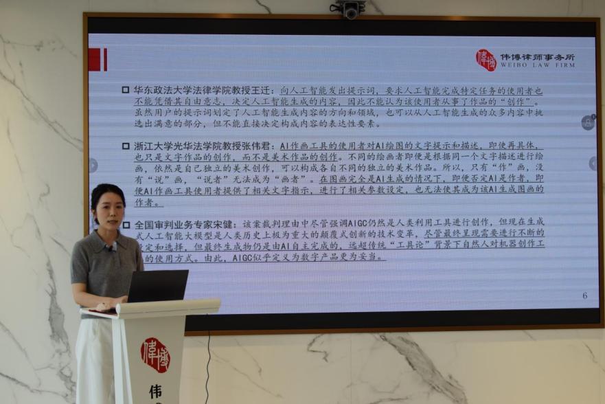 偉博律所律師曹琳娜以《AIGC司法裁判最新動向》為題,聚焦行業(yè)前沿,深入分析了近期備受關(guān)注的“春風(fēng)案”和“蝴蝶椅案”背后的核心問題。曹琳娜認(rèn)為,司法實踐需認(rèn)真審視AI軟件用戶與AI軟件的交互關(guān)系,審慎考量作品性質(zhì),并從法律要件的角度進行分析定性,而“蝴蝶椅案”對AIGC產(chǎn)業(yè)的發(fā)展和對AIGC產(chǎn)物的應(yīng)用與保護作出了有益探索。