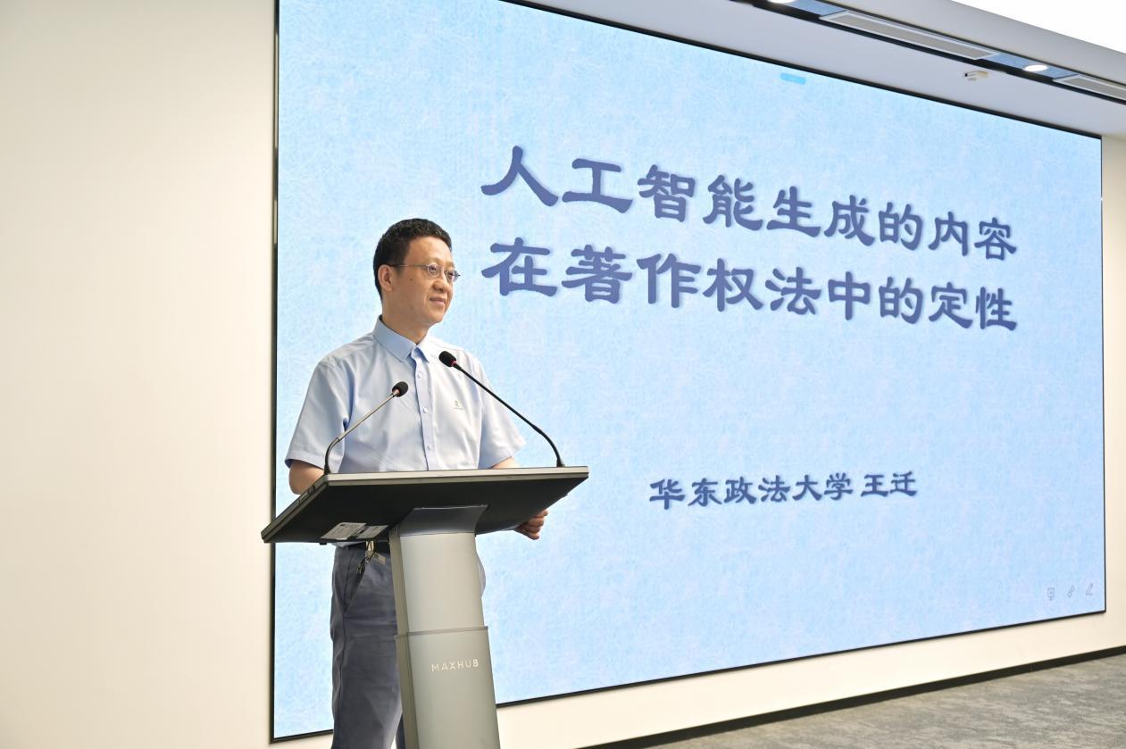 在四個(gè)小時(shí)的課程講解中,王遷教授就其觀點(diǎn)系統(tǒng)梳理了人工智能技術(shù)在內(nèi)容生成、數(shù)據(jù)處理等領(lǐng)域帶來的著作權(quán)法新挑戰(zhàn)。他圍繞AI生成內(nèi)容的可版權(quán)性認(rèn)定、權(quán)利歸屬、訓(xùn)練數(shù)據(jù)使用的合法性邊界、AI“創(chuàng)作”對(duì)傳統(tǒng)著作權(quán)制度的沖擊與調(diào)適等核心議題,進(jìn)行了鞭辟入里的分析。不僅闡釋了現(xiàn)行法律框架下的理論難點(diǎn),更結(jié)合國(guó)內(nèi)外最新立法動(dòng)態(tài)、司法判例及產(chǎn)業(yè)實(shí)踐,提出了富有洞見的思考方向與可能的解決路徑。