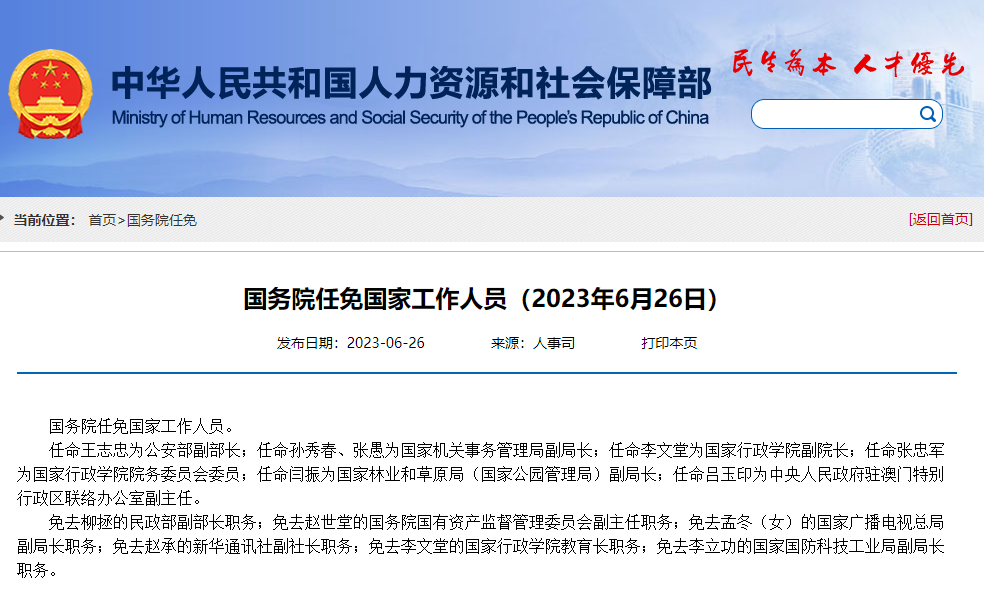 免去柳拯的民政部副部長(zhǎng)職務(wù);免去趙世堂的國(guó)務(wù)院國(guó)有資產(chǎn)監(jiān)督管理委員會(huì)副主任職務(wù);免去孟冬(女)的國(guó)家廣播電視總局副局長(zhǎng)職務(wù);免去趙承的新華通訊社副社長(zhǎng)職務(wù);免去李文堂的國(guó)家行政學(xué)院教育長(zhǎng)職務(wù);免去李立功的國(guó)家國(guó)防科技工業(yè)局副局長(zhǎng)職務(wù)。