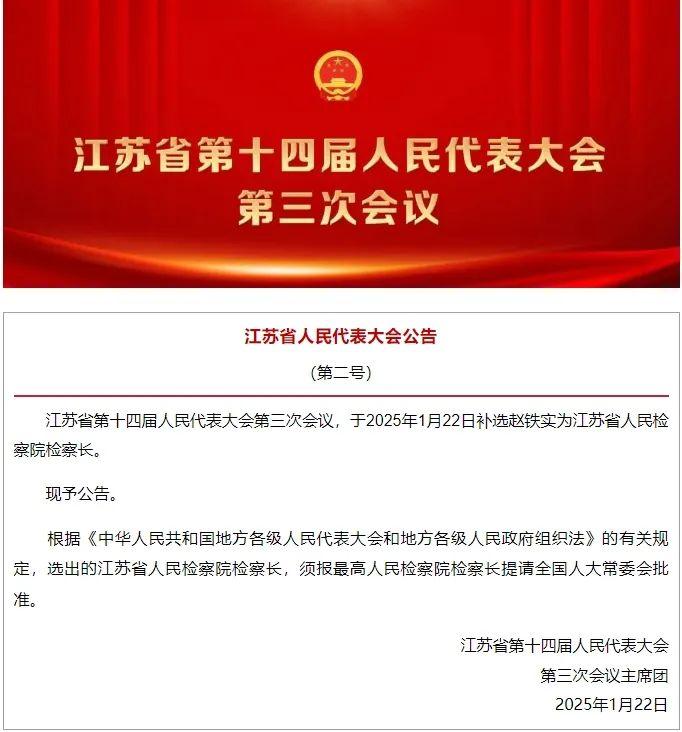 1月22日,江蘇省第十四屆人民代表大會(huì)第三次會(huì)議舉行第三次全體會(huì)議,補(bǔ)選趙鐵實(shí)為江蘇省人民檢察院檢察長(zhǎng)。