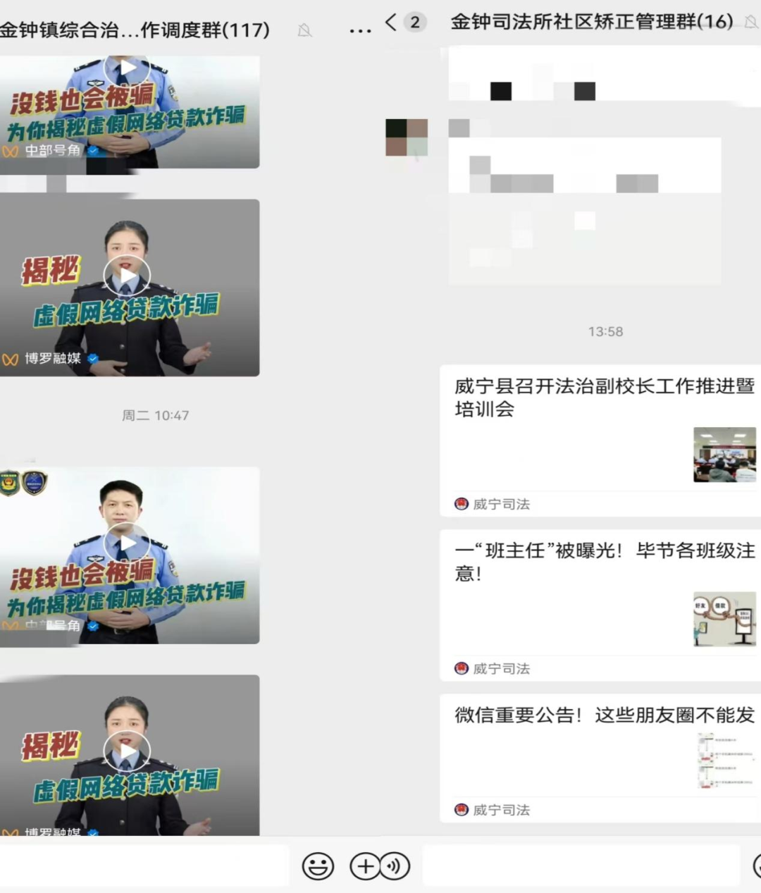 借助微信群的便捷性,金鐘司法所建立了多個(gè)微信工作群,定期推送法律條文解讀、典型案例分析等內(nèi)容,為群眾提供了一個(gè)便捷、高效的線上學(xué)習(xí)平臺(tái)。同時(shí),司法所工作人員針對(duì)微信群里群眾咨詢的法律問題及時(shí)解答,形成了良好的互動(dòng)交流氛圍。2023年以來,金鐘司法所通過微信工作群轉(zhuǎn)發(fā)普法案例及短視頻近1萬條,覆蓋2萬余名群眾。