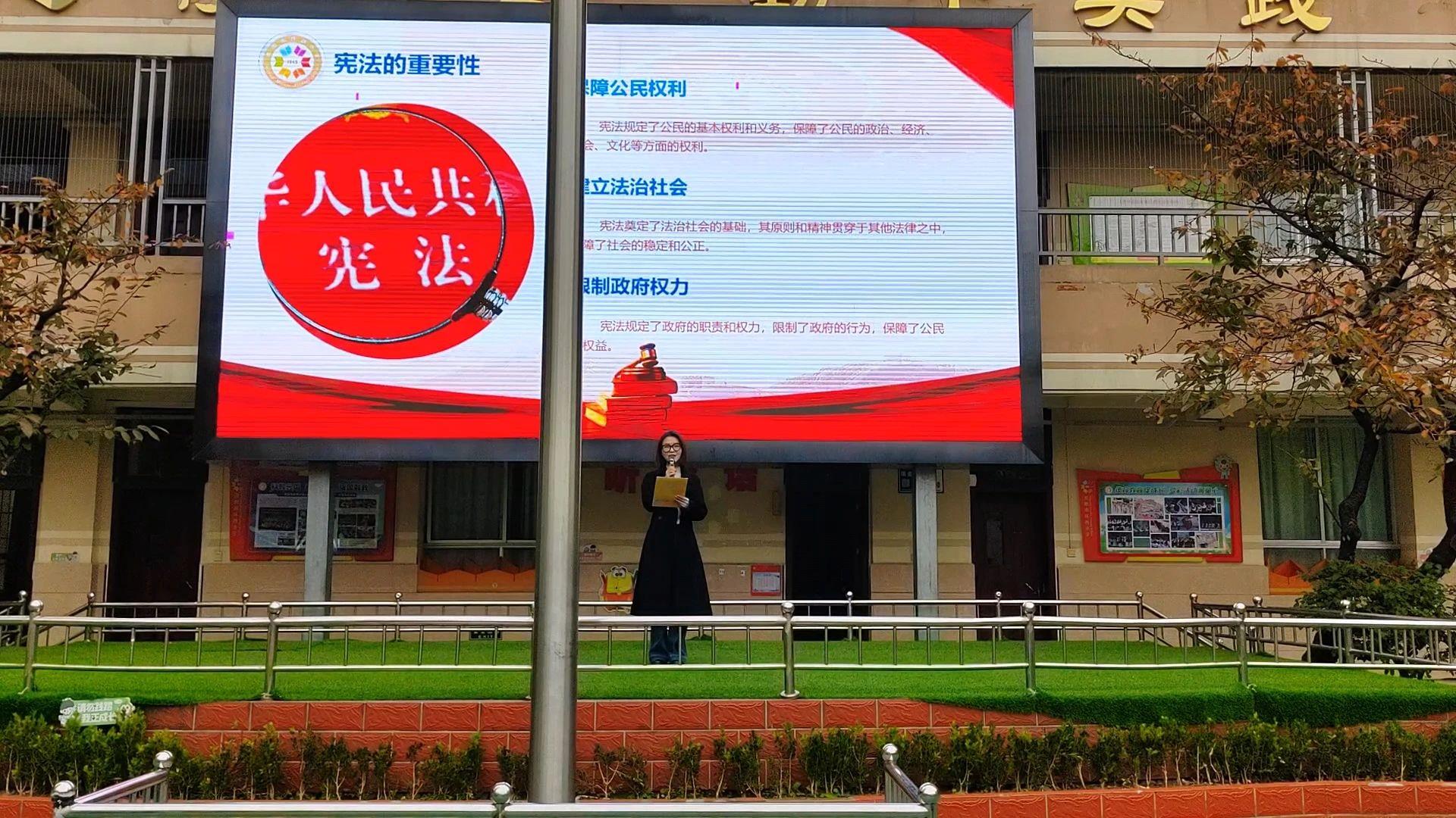 活動現(xiàn)場,法治副校長深入淺出地向?qū)W校師生講解憲法知識,全面闡述了憲法的本質(zhì)、地位、核心內(nèi)容,并探討了憲法與青少年成長的緊密聯(lián)系。期間,學生代表領讀《中華人民共和國憲法》的重要篇章,并在法治副校長的引領下進行了憲法宣誓。