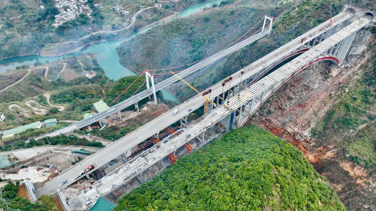 烏蒙山大橋,是在建的納晴高速公路的重點(diǎn)控制性工程之一,大橋建成后,將成為世界首座大跨度裝配化鋼桁腹桿—混凝土組合拱橋,形成山區(qū)大跨度鋼桁腹桿-混凝土組合拱橋的施工技術(shù)體系,豐富200米至400米跨徑的橋梁結(jié)構(gòu)類型,將成為我國具有里程碑意義的橋梁。