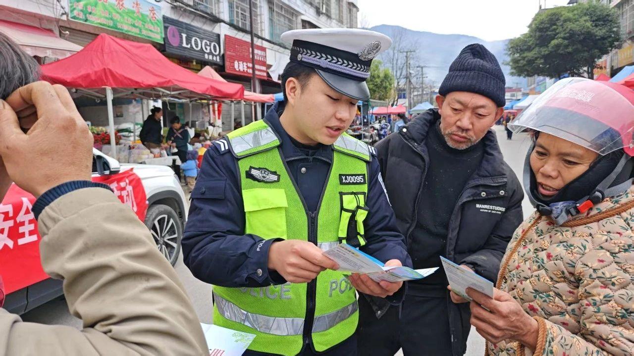在農(nóng)村趕集日,宣傳民警來(lái)到集市中心,設(shè)置宣傳點(diǎn),擺放交通安全宣傳展板,并向群眾發(fā)放宣傳手冊(cè)。與此同時(shí),為助力群眾合法合規(guī)上路行駛,民輔警還現(xiàn)場(chǎng)詳細(xì)講解摩托車上牌辦證的規(guī)范流程,引導(dǎo)群眾主動(dòng)遵守交通法規(guī)。