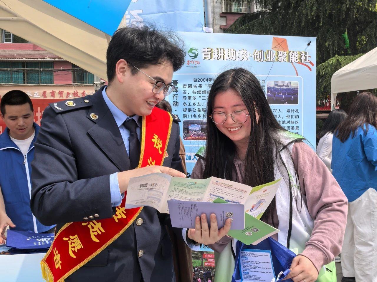 在活動(dòng)現(xiàn)場(chǎng),稅法宣傳志愿者穿梭于“青聽(tīng)心聲·鄰里會(huì)客廳”“青護(hù)家園·環(huán)保先鋒營(yíng)”“青耕助農(nóng)·創(chuàng)業(yè)聚能社”等展示區(qū),用通俗易懂的語(yǔ)言為“擺攤者”“趕集者”講解個(gè)人所得稅專項(xiàng)附加扣除、重點(diǎn)群體創(chuàng)業(yè)就業(yè)稅收優(yōu)惠、社保費(fèi)繳納流程等與群眾生活、經(jīng)營(yíng)息息相關(guān)的熱點(diǎn)稅收知識(shí)。此次活動(dòng)還設(shè)置了稅法咨詢臺(tái),為前來(lái)咨詢的商戶、青年提供“一對(duì)一”答疑服務(wù),并發(fā)放印有國(guó)家稅務(wù)總局微信公眾號(hào)二維碼的宣傳折頁(yè),方便青年群體掃碼獲取更多稅收知識(shí)。