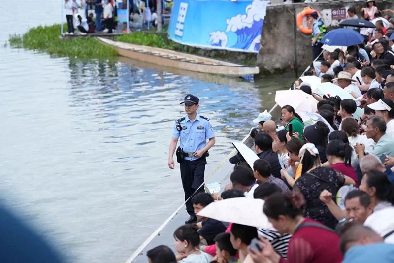 圖為銅仁公安民警在龍舟賽現(xiàn)場執(zhí)勤。